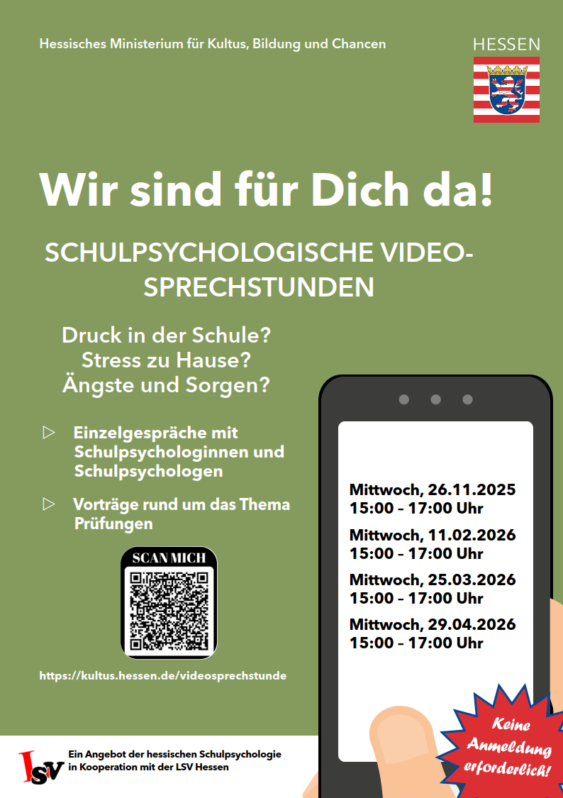 Die Landesschüler*innen-Vertretung und das Team der Schulpsychologie haben Videosprechstunden für Schüler*innen organisiert. Die Themen und Termine finden sich in der Anlage. Es ist keine Anmeldung notwendig. Die Teilnahme ist über den QR-Code möglich. Während der Sprechstunde gibt es Möglichkeiten der Einzelberatung. Das nächste Angebot ist am Mittwoch, den 11.02.206, in der Zeit von 15:00 Uhr bis 17:00 Uhr.