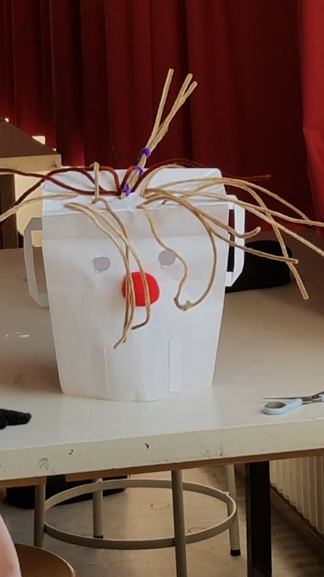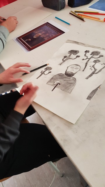 Mit verschiedenen Materialien wie Kohle, Tusche, Stift begannen sie zu arbeiten. Dabei galt: Radieren – nein, weiterzeichnen – ja. Erweiterndfotografierten die SuS mit dem Handy auf dem Schulhof Dinge, die ein Gesicht ergeben. Das war eine gute Abwechslung. Zwischendrin fügte sich ein Ausflug zum Städel an, um an einer Führung zu ausgewählten Portraits teilzunehmen. Die SuS entdeckten z.T. neue Dimensionen, in denen „Kunst" stattfindet und wertgeschätzt wird. Einige der gesehenen Kunstwerke dienten als Vorlage für Zeichnungen wieder zurück in der Schule. Zuletzt ging es ins Plastische: Masken. Einmal aus Papiertüten gestaltet, zum anderen aus Gipsformen, die vom eigenen Gesicht abgenommen wurden.