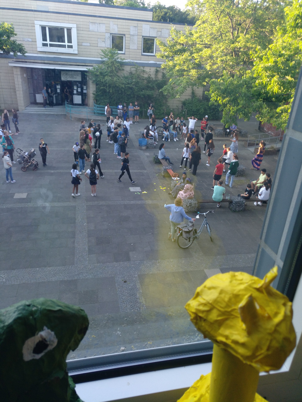 Am 21.06.2022 wurden im Rahmen eines Kulturabends die Ergebnisse dieser Arbeit präsentiert. Drei Theatergruppen zeigten ihre Stücke. Zwischen den Vorführungen traten die Schüler*innen aus den Kursen Saiteninstrumente und Bläser auf. Vor und nach der Veranstaltung war es möglich, die Werke der Kunstkurse in einem kleinen Rundgang zu betrachten. Der Abend endete mit einem Tanzangebot für alle vor dem Schultheaterstudio.