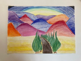 Die Erkenntnisse haben Sie in den folgenden Bildern umgesetzt. Die Aufgabenstellung beinhaltete einige zuvor festgelegte Kriterien: eine Bergkette sollte sich hintereinander staffeln und immer blasser werden – je weiter man in die Tiefe schaut, ein Weg sollte mit einer Baumallee auf die Berge zulaufen. Die Komposition und Farbwahl darüber hinaus waren frei wählbar. In der Regel haben die Schüler*innen mit Aquarellfarbe gemalt, es haben sich aber auch einige für das Arbeiten mit Aquarellbuntstiften entschieden.
