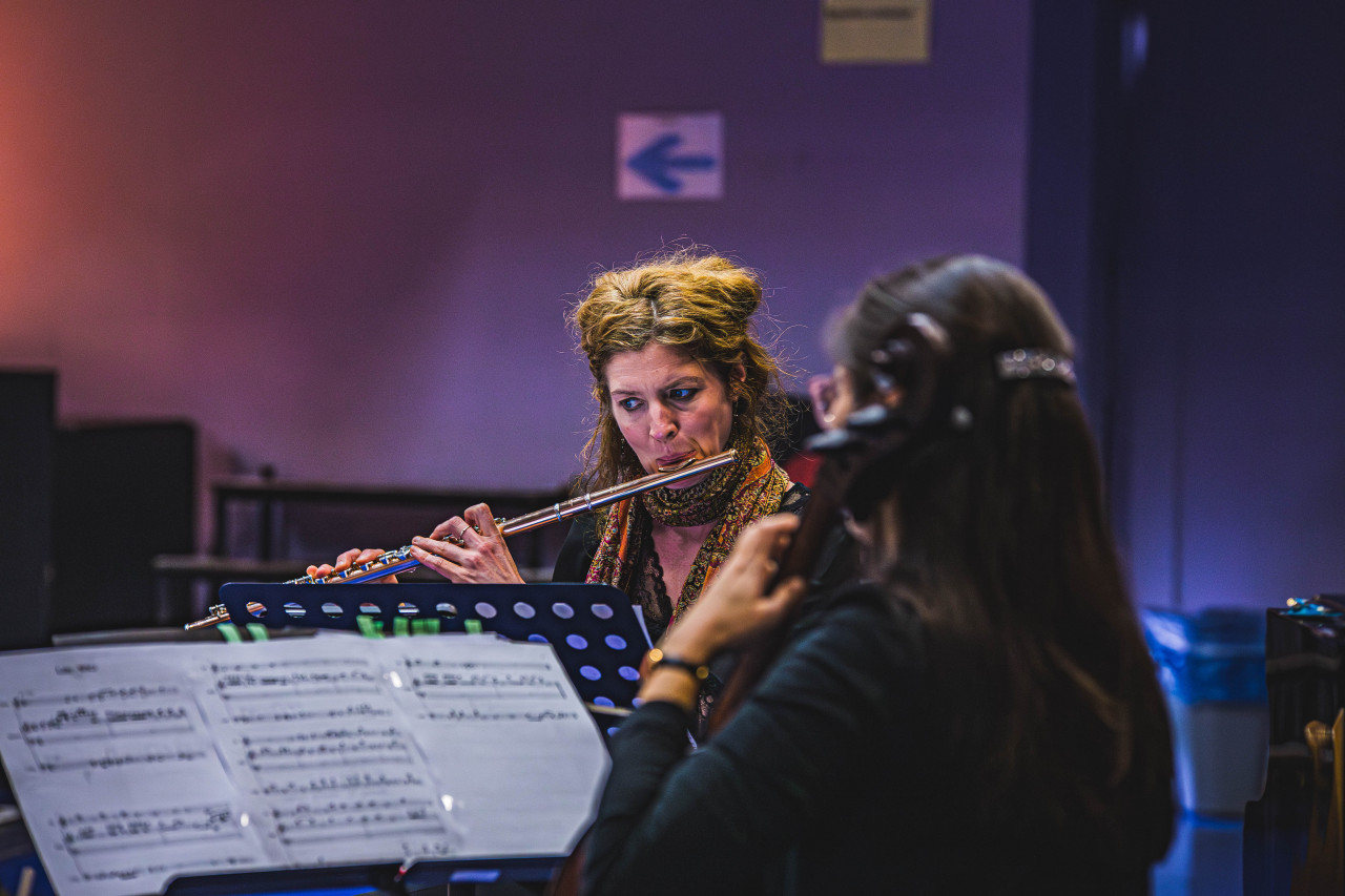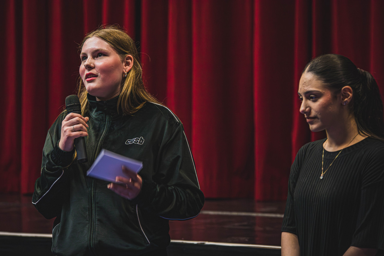 Das Trio, bestehend aus Sylvia Demgenski (Cello), Ekaterina Kintsurashvili (Klavier) und Delphine Roche (Flöte), spielte 41 Miniaturen (kurze Kompositionen) von Schülerinnen und Schülern der Klassen 10a und 10d. Mit bewundernswerter Musikalität, Präzision und Energie spielte das Trio das durchaus anspruchsvolle Programm. Neben Nicola Vock (Geschäftsführerin der Kammerphilharmonie) und Herrn Kitzinger führten Schülerinnen und Schüler der beiden Klassen durch das Programm und gaben in Interviews Auskunft über die Arbeit im Projekt. Nina Koch, die Leiterin des Programms „Kunstvoll" (Kulturfonds Frankfurt Rhein-Main), durch welches das Projekt unterstützt wird, berichtete am Ende des Konzertes begeistert, wie sie im Laufe des Abends mit auf eine Reise durch verschiedenste Emotionen und Situationen genommen wurde. Es ging von Frohsinn und Glück über Piratenschiffe und Wüsten bis hin zu Trauer und Verzweiflung.