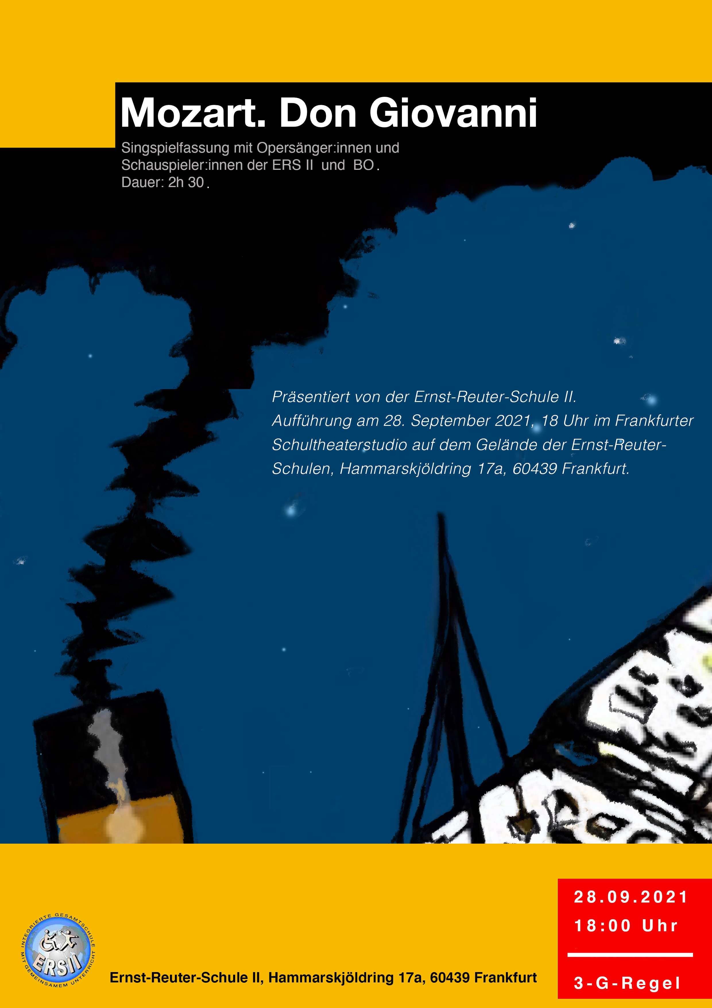 Am 28. September 2021 findet unsere mehrfach verschobene Aufführung der Oper Don Giovanni im Schultheaterstudio statt. Die Veranstaltung beginnt um 18 Uhr. Eingeladen sind nicht nur die Mitglieder der Schulgemeinde, sondern alle Interessierten. Beim Einlass muss ein 3G-Nachweis erbracht werden. Die Oper wird gestaltet von professionellen Musikern und Schüler*innen und Lehrkräfte der Ernst-Reuter-Schule II. Die Regie führt Herr Stefan Beck.