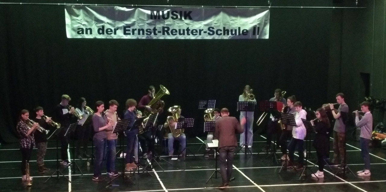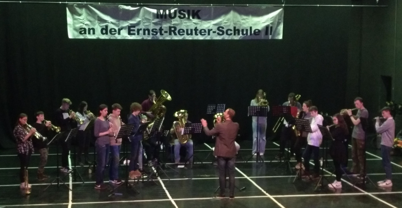 Nach der Pause war dann die Konzertband unter Leitung von Herrn Andreas Scheer und Herrn Wolfgang Schmitt-Gauer dran, die sich aus Schüler*innen der ERS II und ERS 1 zusammensetzt. Bei diesem Konzert wurde sie noch ergänzt von Ehemaligen.