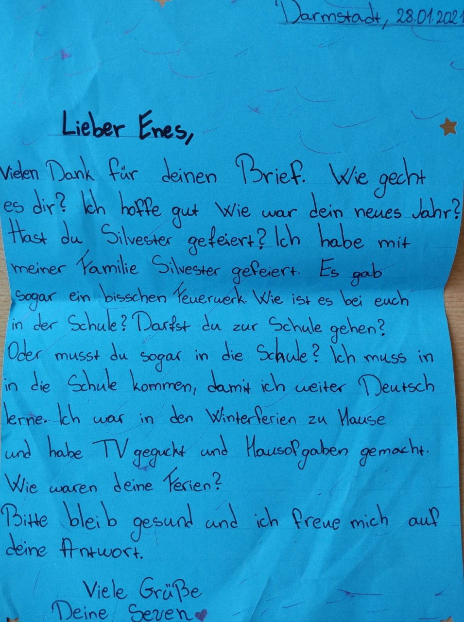 Seit über 1,5 Jahren pflegen unsere Intensivklassenschüler/-innen eine Brieffreundschaft mit den Intensivklassenschüler/-innen der Mornewegschule in Darmstadt.