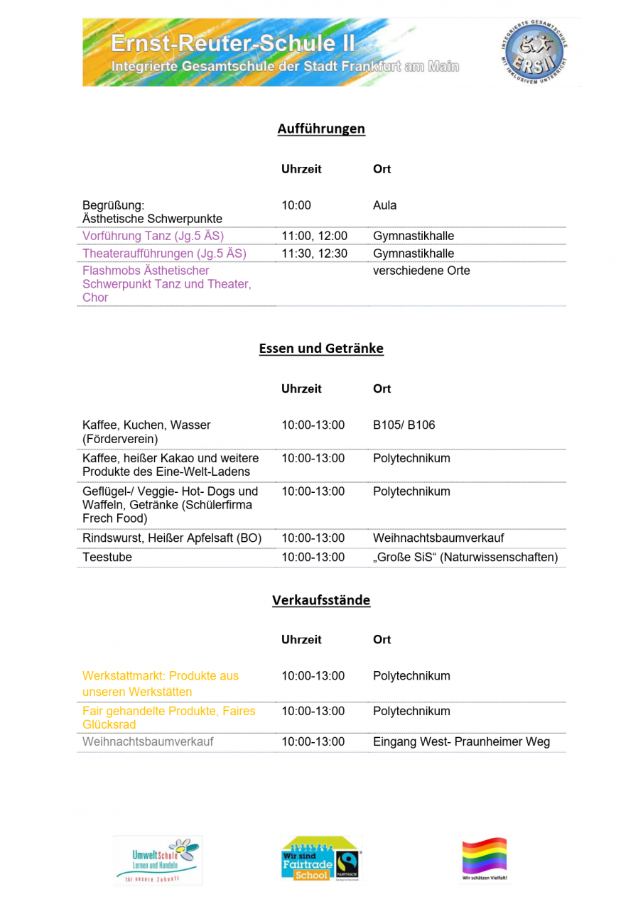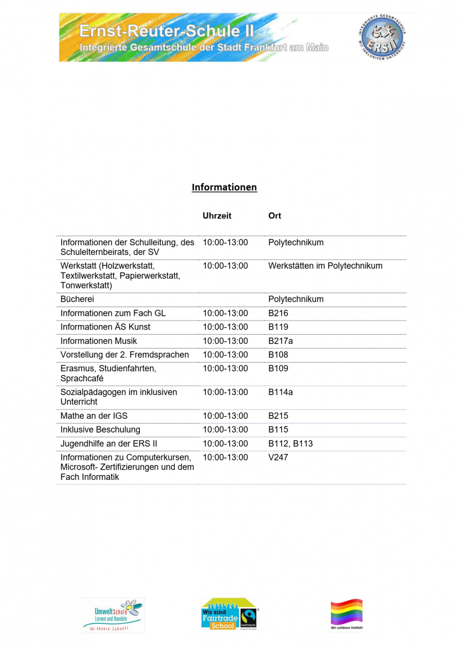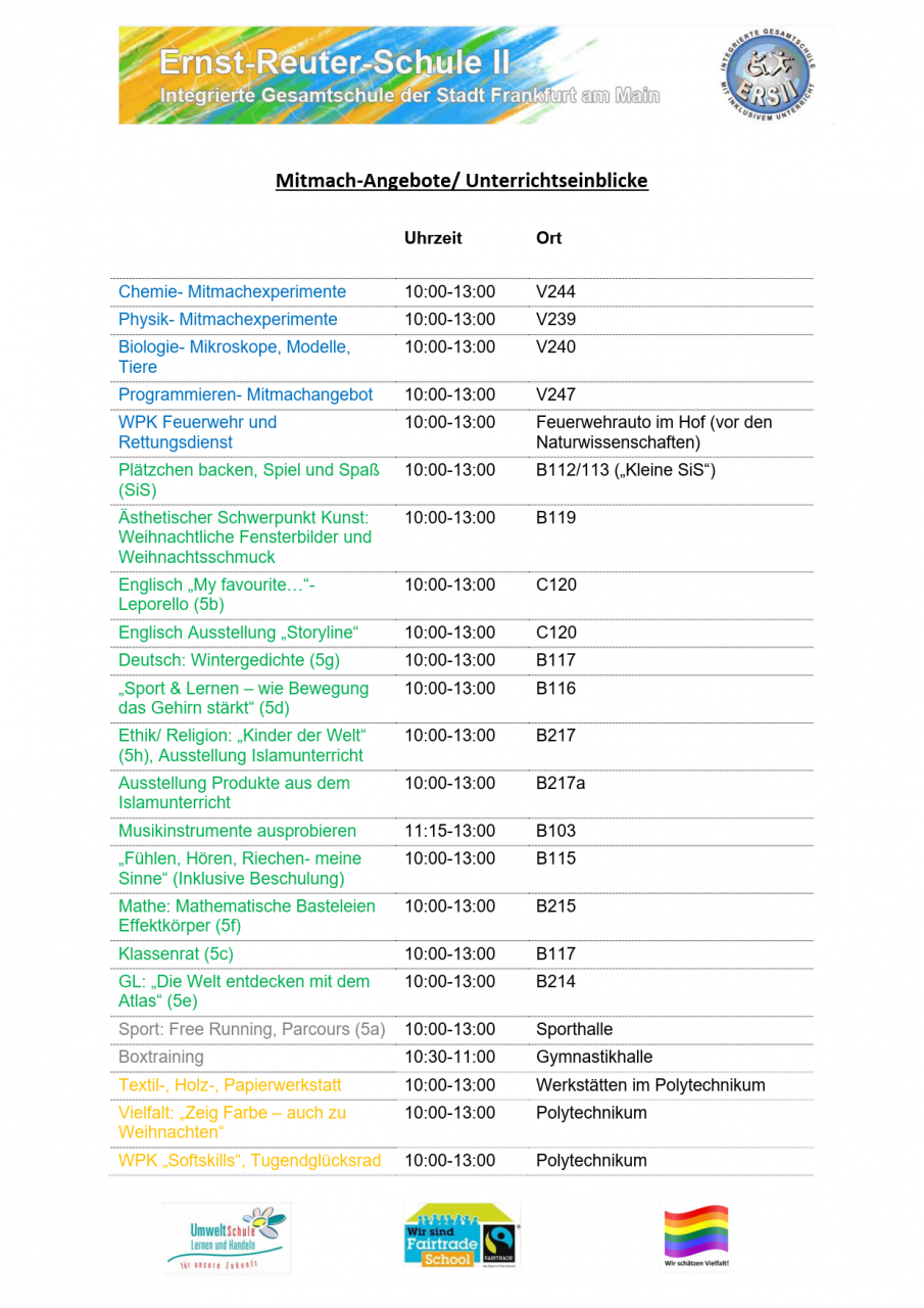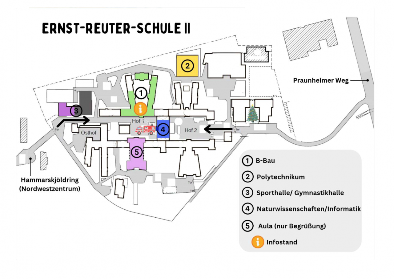 Wir begrüßen Sie gerne am 13.12.2025 von 10 bis 13 Uhr zu unserem diesjährigen Tag der offenen Tür . Sie haben die Möglichkeit, einen Eindruck unserer Schule zu gewinnen. Dafür gibt es Schulführungen, Informationsveranstaltungen und die Möglichkeit des direkten Gesprächs mit der Schulleitung und den Lehrkräften der Ernst-Reuter-Schule II. Für alle Kinder wird es Mitmachangebote und Konzerte geben. Bei unserer Schulrallye gibt es viel zu entdecken. Wir freuen uns auf Ihren Besuch!
