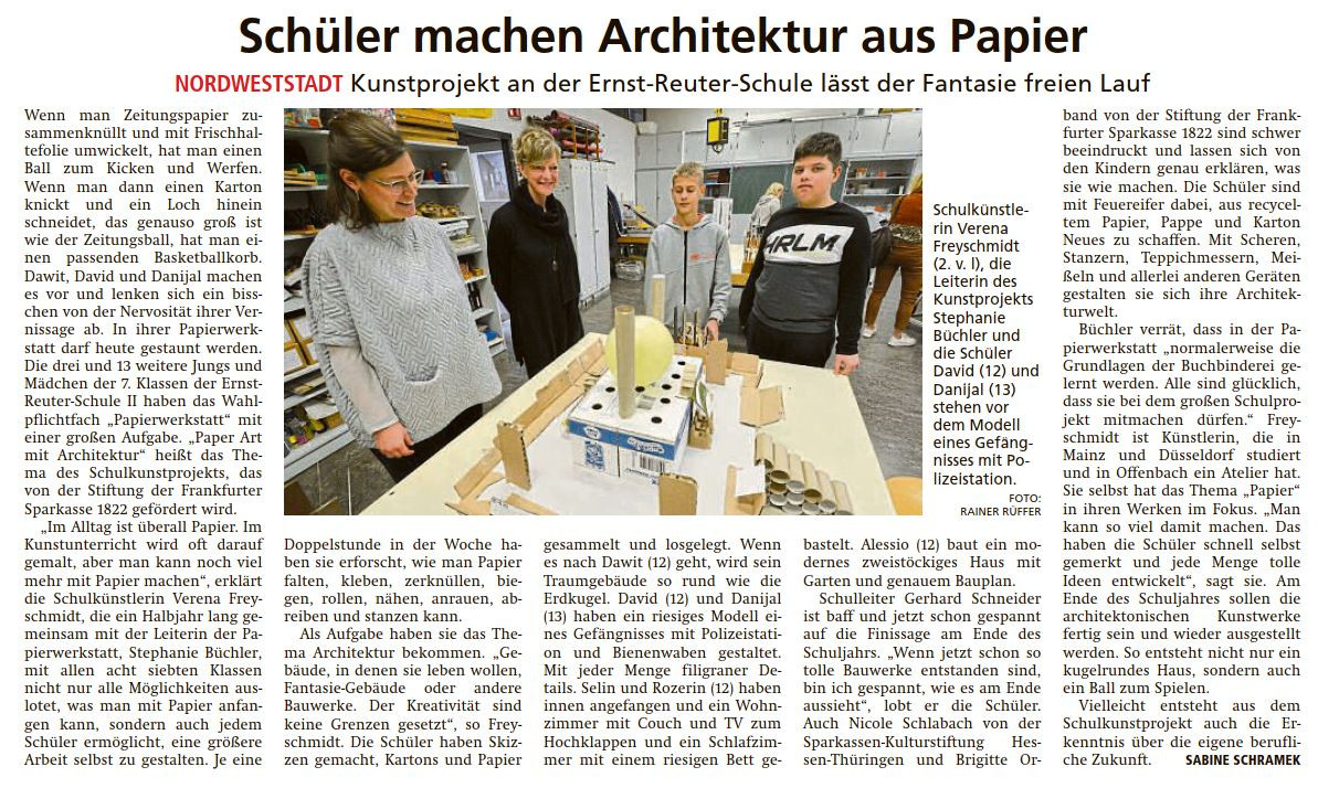 Verena Freyschmidt heißt unser Schulkünstlerin Im Rahmen des Schulkunstprojekts der Stiftung der Frankfurter Sparkasse mit der Sparkassen-Kulturstiftung Hessen-Thüringen. Ihre Arbeiten legen eine Reflexion über Verwendung und Verfügbarkeit das alltäglichen Materials Paper nahe. Zur Vernissage im Polytechnikum unserer Schule am 09.11.2022 sprachen auch